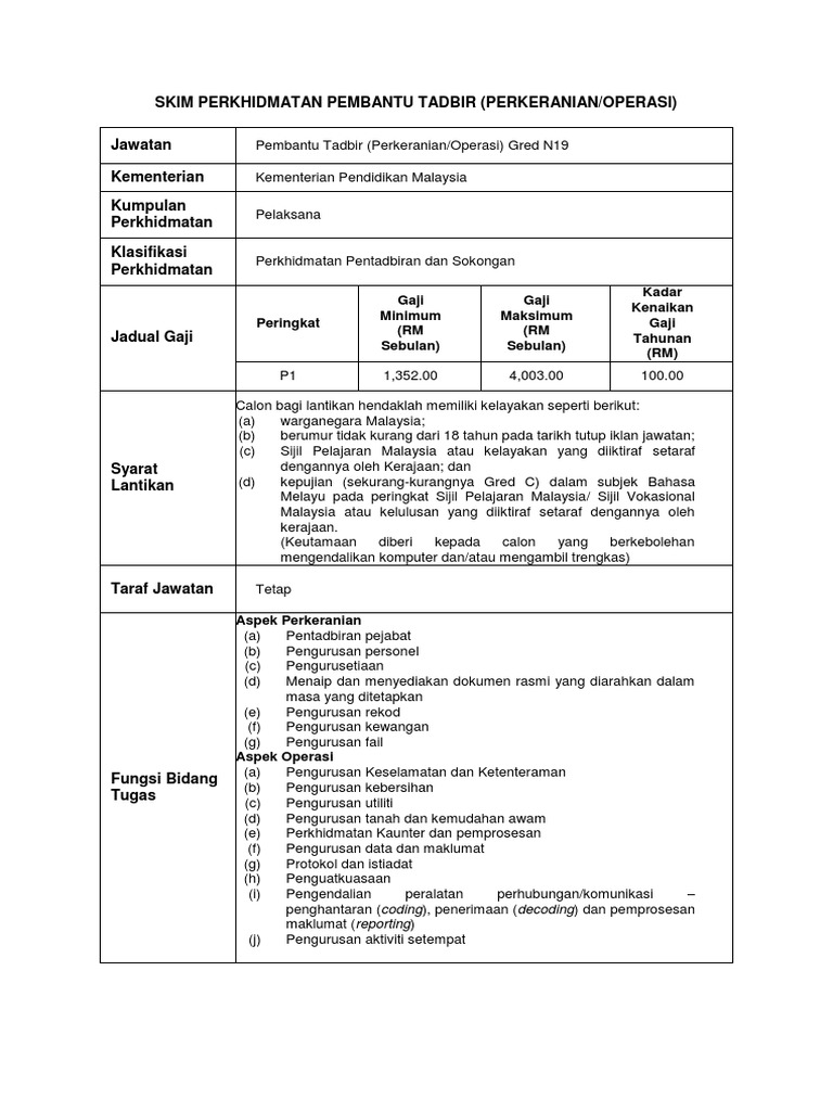 Pembantu Tadbir Perkeranian Operasi Gred N19 Tugas Gaji Syarat Lantikan Spa Kerjaya